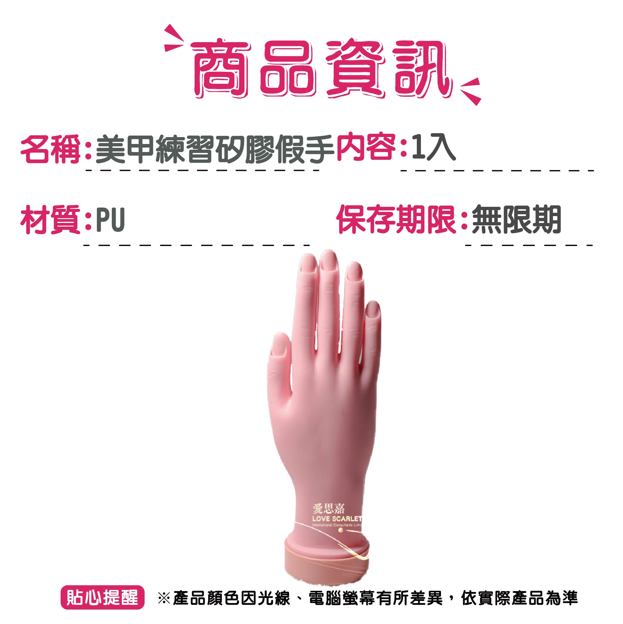 ◆產品介紹:練習美甲的好幫手 直接練習一隻用來學習練習美甲的美甲手,在指甲前端的空隙中模仿指甲的弧度。