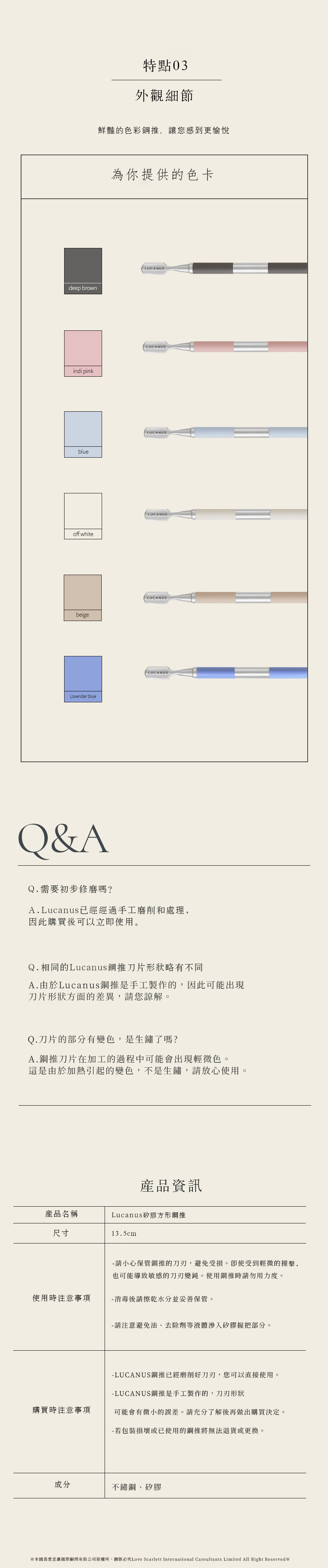 此款刀口較銳利,在推甘皮時,角度盡量與甲面平行,才不會傷到甲面喔!